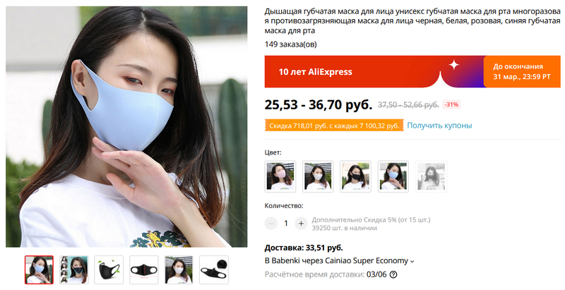 Кстати, по поводу средства защиты, а именно масок. Из Китая они по 25-36 рублей (плюс 33 рубля доставка) - это просто навскидку.