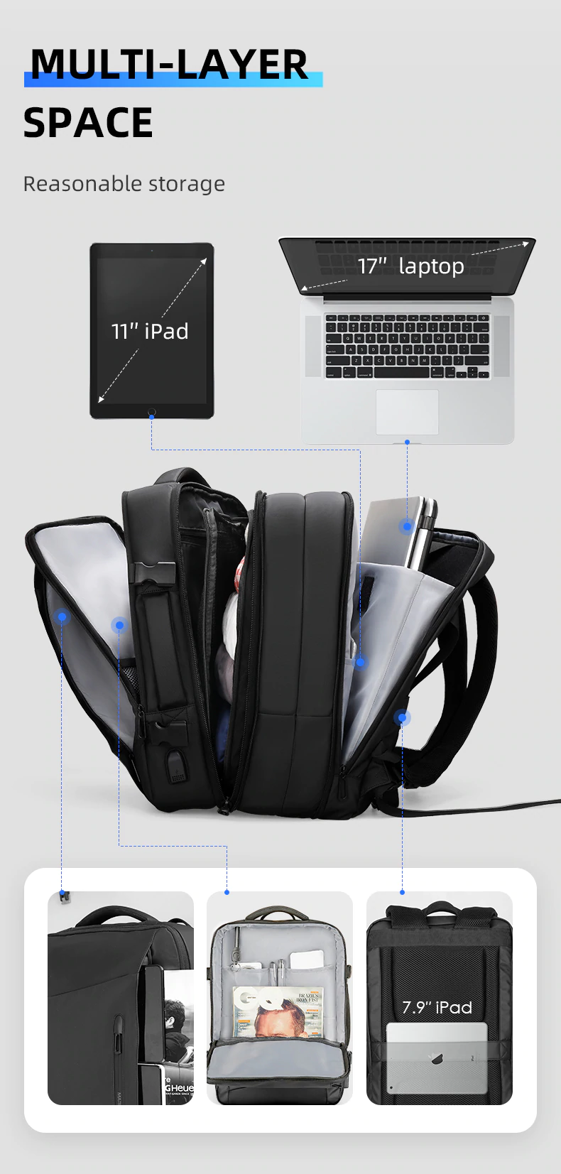 Водоотталкивающая ткань, антивор, USB зарядка, куча отделений.