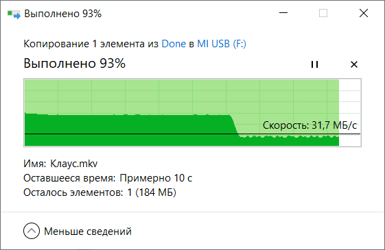 Практический замер - отправлял файл в 2,7 ГБ. Первые 2 ГБ шли со скоростью 84 мегабайта в секунду, что довольно быстро для флешки, потом упало где-то до 32 мегабайт. Что, в общем, тоже терпимо.