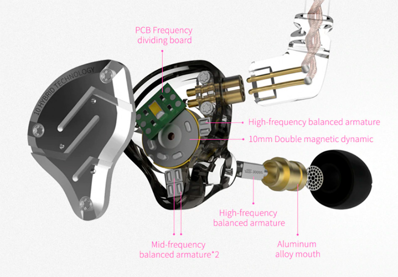 Это пятидрайверные наушники: один динамический излучатель 10 мм и четыре арматурных излучателя - два для средних частот и два для высоких. Вот их схема. Вес - 80 граммов.