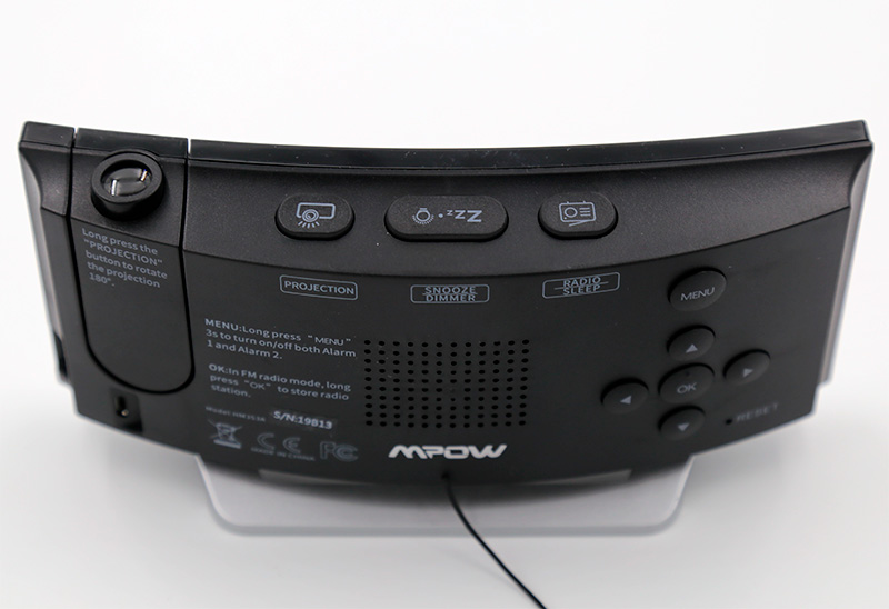 На верхней панели - включение/выключение проектора, выключение (или откладывание) будильника, включение радио. На задней части - динамик и кнопки управления.