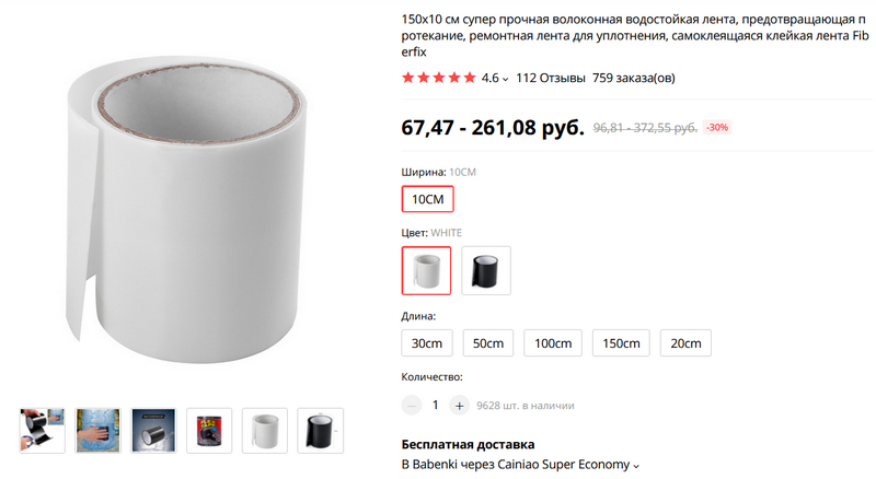 Вот это мне друг подсказал: он заказывал и говорит, что реально хорошо работает. Водостойкая прочная волоконная лента для быстрого и надежного ремонта всяких протечек. Потекла труба? Обмотали этой лентой, и больше течь не будет. Это, замечу, не означает, что не нужно вызвать сантехника, чтобы все сделать по-правильному, но проблему на время решает, причем на продолжительное время (кто там знает, когда сантехник вообще соизволит прийти). Я себе заказал, бывают такие случаи. А уж если что-то потекло в пятницу, то раньше вторника-среды в Испании вообще никто не придет. Так что спасаемся своими силами. Там можно выбрать длину ленты - от 20 до 150 см.