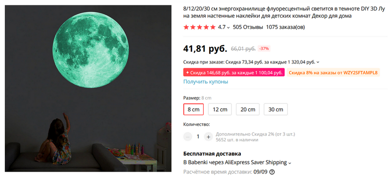 Это скорее для детишек - светящаяся наклейка Луны (разных размеров) для стены, шкафов, дверей и так далее. Светится неярко, может быть типа как ночником.