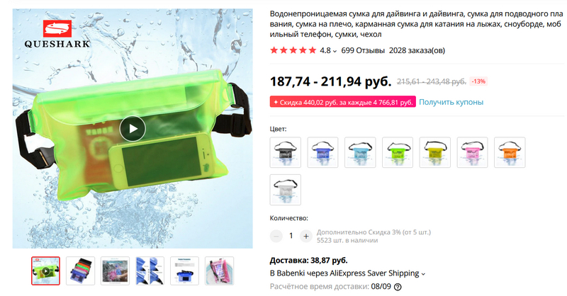 Хороший летний (и одновременно зимний) вариант: водонепроницаемая сумка на пояс для смартфона и других мелочей. На пляже, на горнолыжном курорте, да куда угодно! И разных цветов!