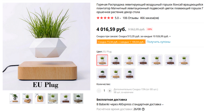 Вот люблю такие штуки - левитирующий горшок с какой-то травкой. Травку еще нужно вырастить - там приедут семена. Но когда вырастет - будет левитировать. И даже в виде семян будет левитировать. Я заказал: надеюсь, меня удивят и травка вырастет какая надо травка! Но понятно, что высылают какую непонятно травку. Но все равно - прикольно.