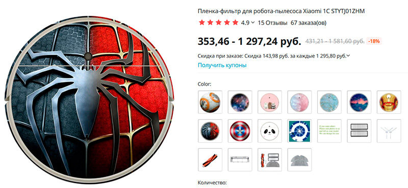 Прикольная какая штука - набор пленок (там несколько элементов) для кастомизации роботов-пылесосов Xiaomi Mijia Sweeping Vacuum Cleaner 1C (и его европейской версии Xiaomi Mi Robot Vacuum-Mop) и Xiaomi Robot Vacuum-Mop 2C (и его китайской версии Xiaomi Mijia Sweeping Vacuum Cleaner 2C). Заказал два комплекта - у меня же как раз две этих модели и есть. Чего они такие скучно-белые катаются? Пускай будут веселенькие.
