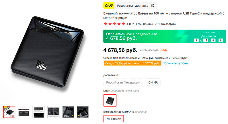 Внешний аккумулятор Baseus на 20000 мАч мощностью 100 ватт для питания ноутбуков (прежде всего) и любых других устройств. Достаточно компактный, имеет информационный дисплей. Два порта Type-C, два порта USB-A. Мощность портов Type-C - 100 ватт, мощность портов USB-A - 65 ватт. Одновременно может питать до трех устройств мощностью 45 ватт, 30 ватт и 18 ватт. Ноутбук за полчаса зарядит на 40-50%, сам для полной зарядки требует 90 минут.