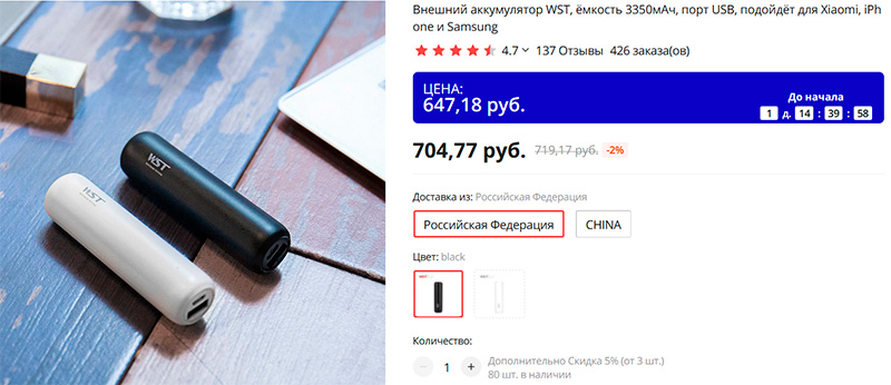 Вот один из таких вариантов - внешний аккумулятор WST на 3350 мАч, размером с помаду для губ. Черного и белого цвета, есть доставка с российского склада.
