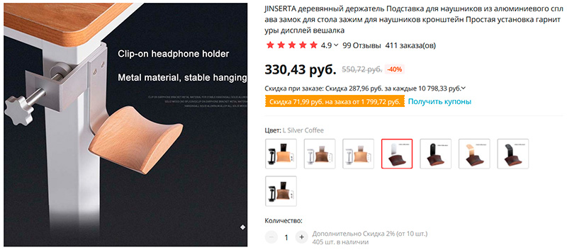 Стильный деревянный держатель для наушников, позволяющий убрать наушники со стола, но чтобы они всегда находились под рукой. Есть разные цвета.