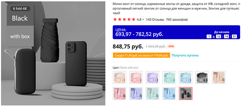 Сверхкомпактные зонты, размером со смартфон (в сложенном виде, разумеется). Для мужчин (черного цвета) и женщин (пять вариантов цветов). Есть просто зонт, а есть в комплекте с чехлом.