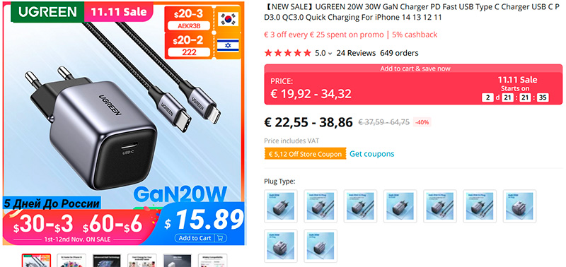 Недорогой компактный зарядный GaN адаптер от Ugreen на 20 или 30 ватт с разными вилками и разными комплектными кабелями.