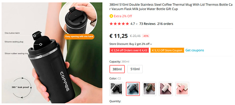 Непротекающая термокружка из нержавеющей стали емкостью 380 или 510 мл пяти различных цветов. Хранит тепло и холод, отзывы хорошие.
