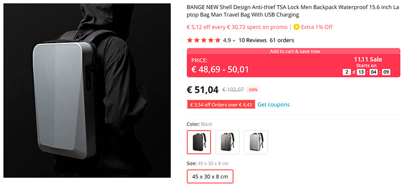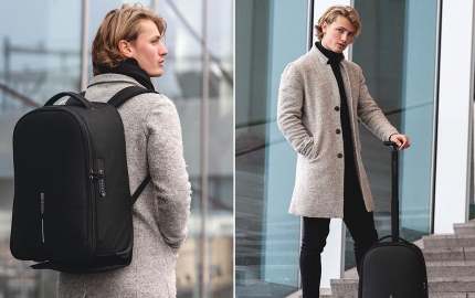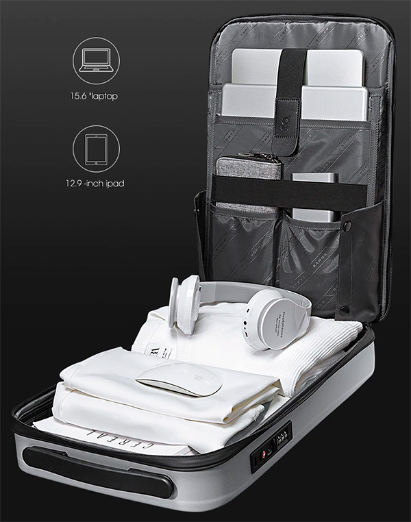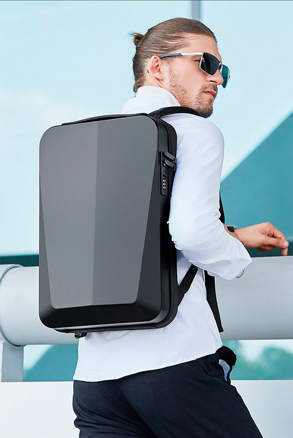 Очень компактный и плоский бизнес-рюкзак Bange из полистирола, влагозащищенный, защищенный от воровства, раскладывающийся на 180 градусов, имеющий замок стандарта TSA и порт для зарядки гаджетов. В него помещается ноутбук вплоть до 15,6 дюймов, также планшет до 12,9 дюймов и всякая мелочевка. Три варианта цветов. Смотрится очень стильно - пожалуй, закажу себе, потом поделюсь впечатлениями, как приедет. А то я свой ноутбук с планшетом в поездках ношу в каком-то обычном бесформенном рюкзачке, а это - вроде совершенно другое дело!