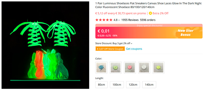 Интересная штука - флуоресцентные шнурки, светящиеся в темноте. Пяти различных цветов, четырех размеров. Я сейчас по вечерам на скандинавскую ходьбу хожу уже в темноте - заказал, посмотрю, как оно в действии, тем более что они копеечные совершенно.
