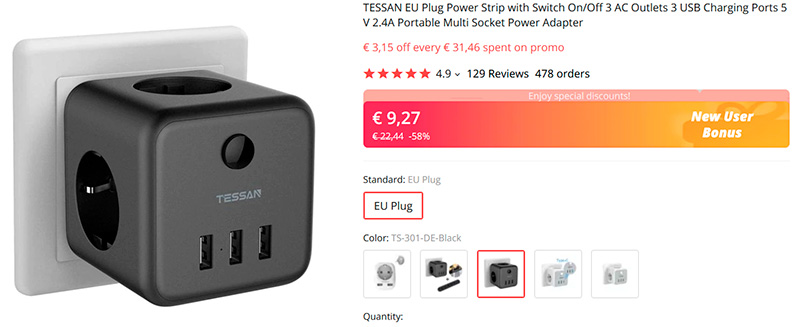 Удобный тройник Tessan с 3 розетками и тремя портами USB-A для зарядки гаджетов. Есть белый вариант, есть вариант с одним портом Type-C.