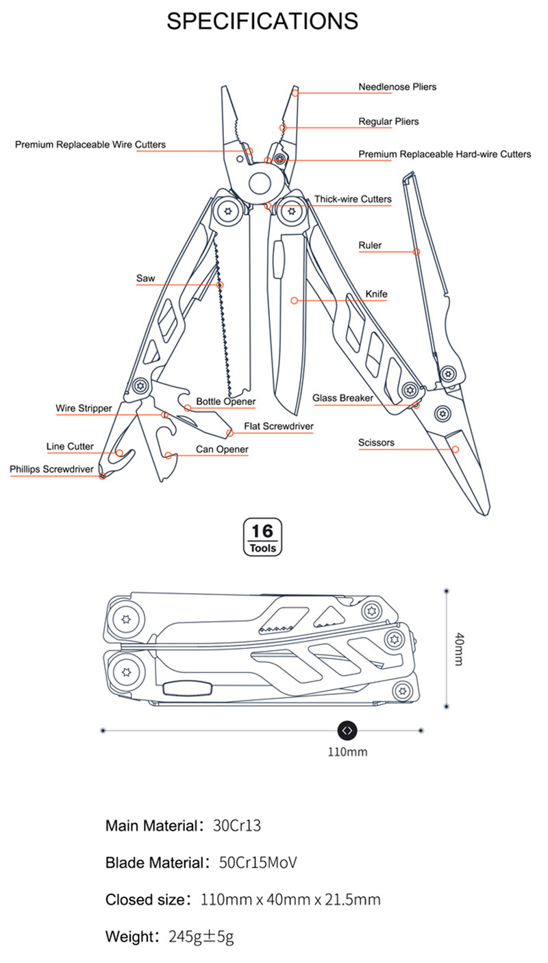 Мультитул NexTool Flagship Pro 16 в 1. Материал - 30Cr13 Alloy Steel.