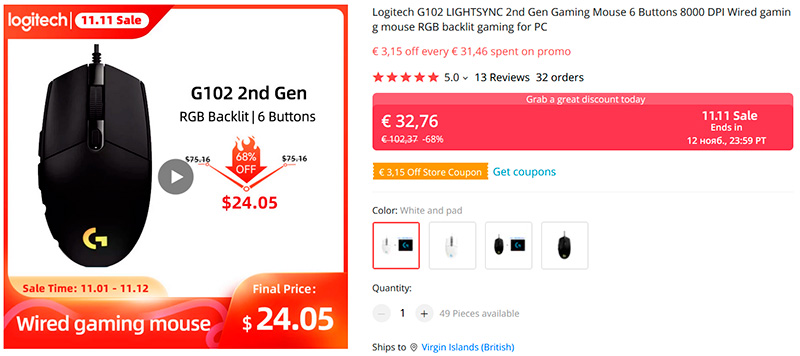 Проводная геймерская мышь Logitech G102 второго поколения с хорошей скидкой на распродаже. Два цвета, шесть программируемых кнопок, сенсор 8000 точек на дюйм, подсветка Lightsync RGB.