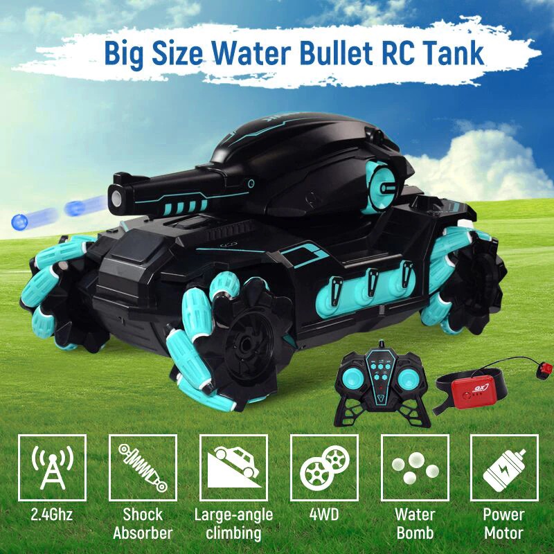 Управляется с пульта или движениями руки, в зависимости от комплектации. В комплекте идут водяные бомбочки, которыми он стреляет. Машинка имеет полный привод и может ездить в любом направлении, даже крутиться по кругу. Для езды не важно покрытие, хоть по траве в горку. Движения сопровождаются музыкой и светом. Танк работает от аккумулятора, которого хватает на 30 минут покатушек. Для работы пульта нужны две АА-батарейки.