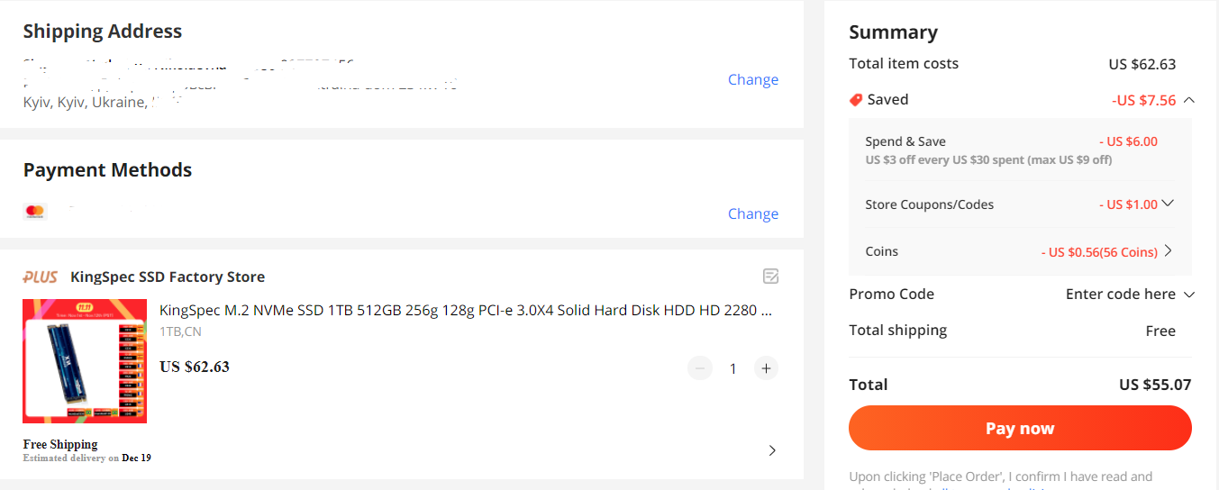 фото прям один в один как на алиэкспрессе, но цена, опять же, 80$, и упоминание про TLC куда-то делось. да и Sold by там уже не KingSpec а какой-то YANSEN Store с рейтингом из 9 отзывов.
