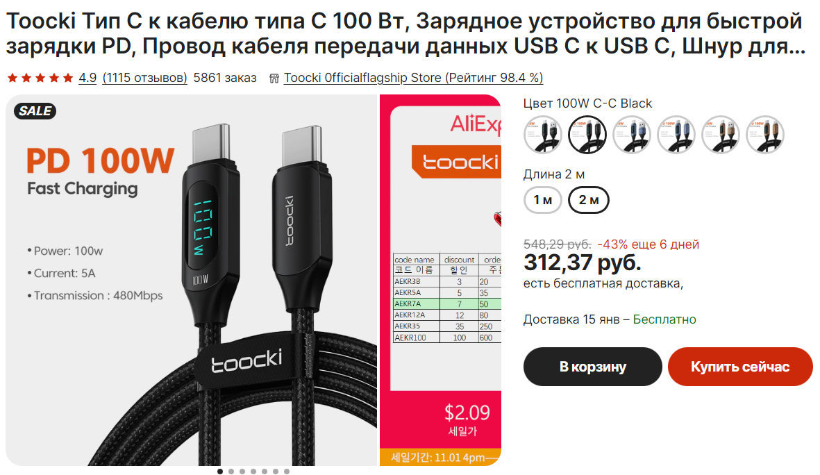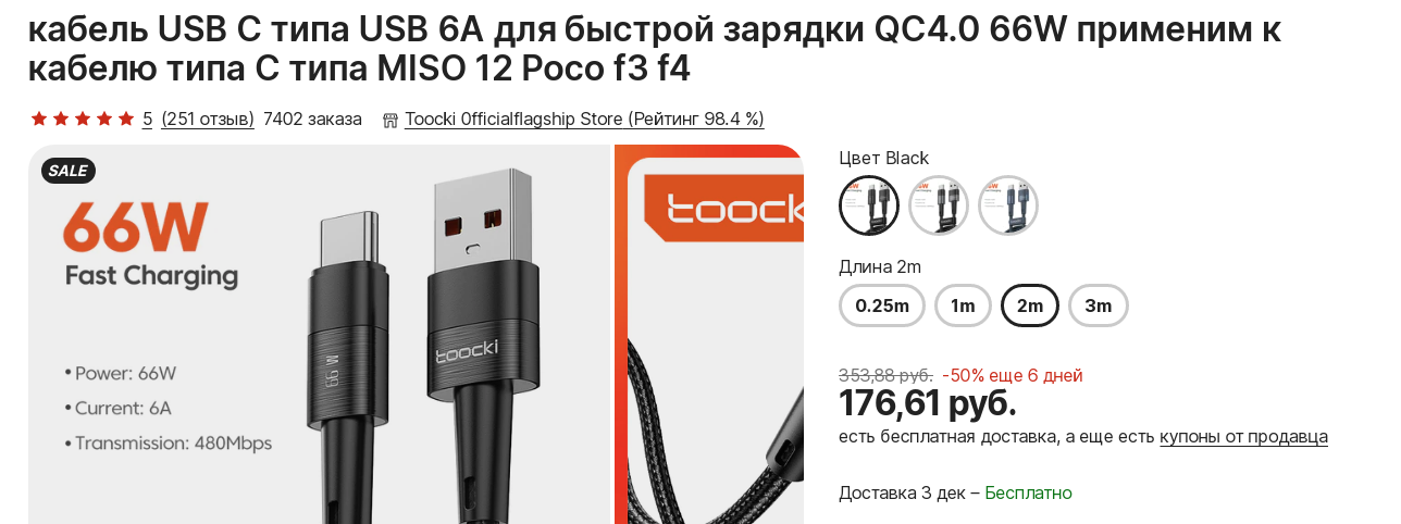 И там же по ссылке есть разные варианты: на 12 ватт для айфона, на 18 ватт, на 66 ватт (они все дешевле), также есть белой расцветки и с головками USB-C вместо USB-A - USB-C. В общем, на любой вкус.