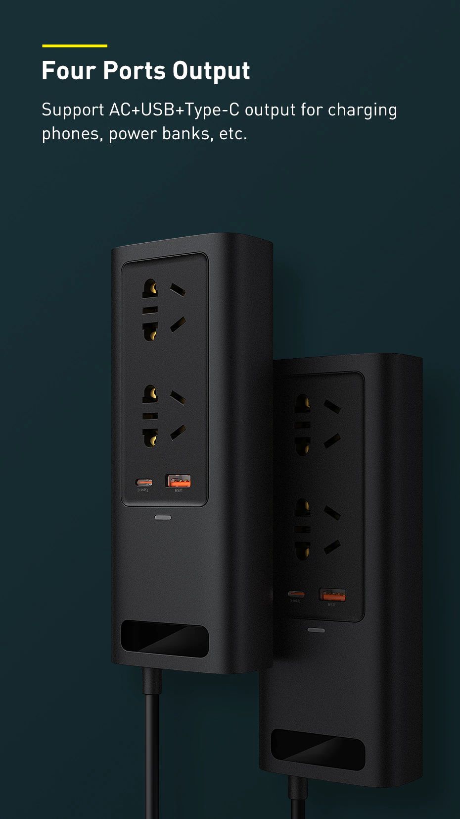 Качественный преобразователь, имеет вход usb, Type-C и два входа для розетки (в зависимости от модели можно выбрать на 220V или 110V). Напряжение держит стабильно без скачков, не перегревается, не шумит. Есть дисплей, отображающий подающийся вольтаж. Есть кнопка выключения. Еще много обычных для Baseus защит. Вещь стоящая, рекомендую.