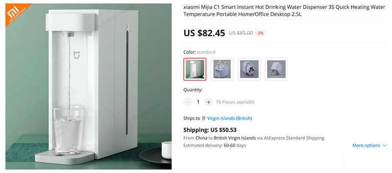 Недавно как раз на сайте мы обсуждали диспенсер для быстрого получения горячей воды. Вот такое устройство от Xiaomi - Xiaomi Mijia C1. Снабжен технологией двойного нагрева, позволяющей начать получать горячую воду всего через 3 секунды. Емкость для воды имеет объем 2,5 литра. Мощность - 2200 Вт. Три клавиши для подачи воды разной температуры, защита от детей.