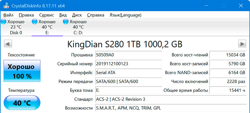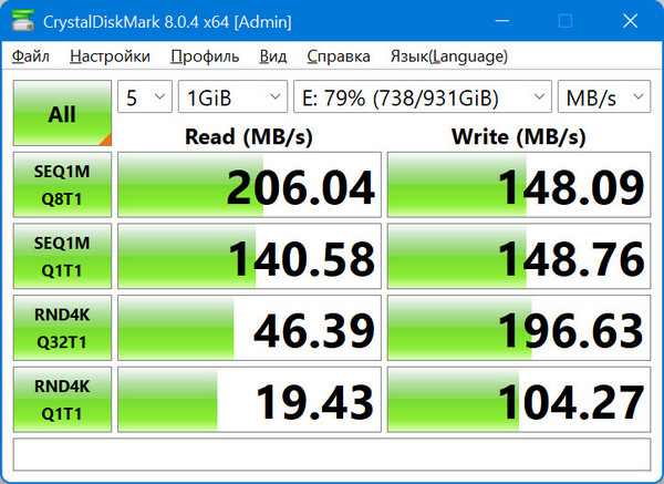 Ну и вот скорости этого терабайтного SSD KingDian. Негусто, но для диска под облачную папку - вполне сойдет.