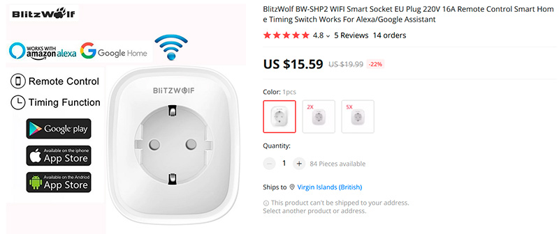 Умная розетка BlitzWolf BW-SHP2 с поддержкой голосового управления Alexa и Google Assistant. Управляется через приложение под Android и iOS, совместима с Google Home, умеет подсчитывать потребляемую энергию. Купил ее, потом покажу, как работает. А то моя нынешняя умная розетка голосовые команды не поддерживает, а хотелось бы.