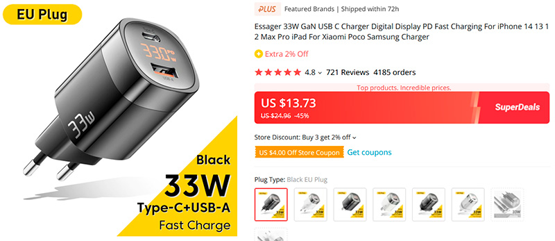 Двухпортовый (Type-C и USB-A) GaN зарядник Essager на 33 ватта с дисплеем, на который выводится мощность зарядки - удобная штука.