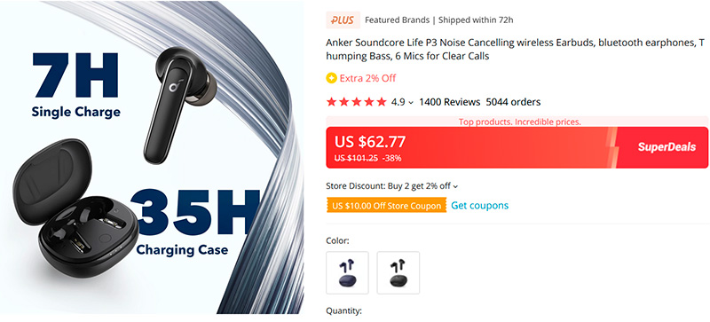 Кстати, о наушниках. Одна из самых популярных моделей TWS-наушников от Anker - Soundcore Life P3. Стоят не слишком дорого, при этом дают хорошее качество звука (кодек AAC) и имеют полный флагманский набор функций: три вида активного шумоподавления (шесть микрофонов), режим прозрачности, управление через приложение, автономность с использованием кейса - до 35 часов, у кейса есть беспроводная зарядка.