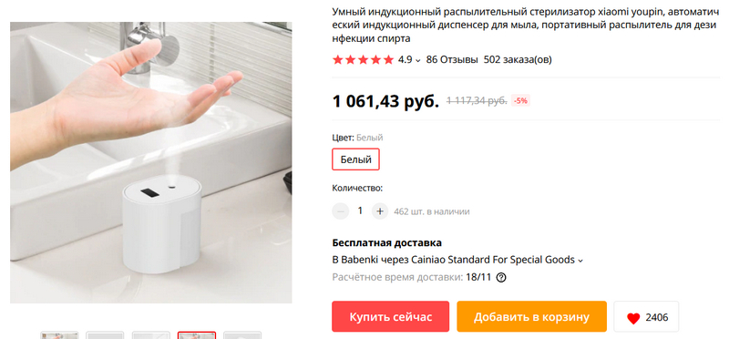 От того же производителя Youpin - автоматический бытовой стерилизатор: полезная штука по нынешним временам. В него заливается дезинфицирующий спиртовой раствор, при поднесении рук (ключей, смартфона) устройство разбрызгивает раствор в виде мелкодисперсного тумана.