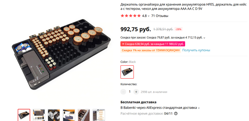 Вот это я себе прям сразу заказал, как увидел, - органайзер для батареек. А то валяется это все кучей в ящике стола, нужно уже порядок навести. Кроме того, здесь еще в комплект входит тестер для уровня заряда - это архиважная и нужная штука (у меня такой отдельный есть, но тем не менее). И здесь важно не только то, что порядок будет наведен и можно будет быстро найти нужные батарейки, а еще и то, что при взгляде на органайзер сразу будет понятно, какие еще батарейки докупить. А то у меня были случаи, когда роешься в этой свалке в поиске, например, батареек ААА, а там - облом, закончились!