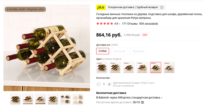 Прям моя тема - деревянные стеллажи под бутылки с вином. Для барной стойки (у меня есть), для кухни. Видел разные стальные - не впечатлили. Деревянные как-то намного более "теплые" и "аналоговые", хотя я сам - человек конкретно цифровой. Но с вином - дайте мне деревянные стеллажи! И здесь есть выбор - от 3 до 10 бутылок. Я взял на 6 бутылок - самое что надо! 3 - маловато, 10 - многовато, 6 - самое что надо!