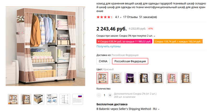 И тогда он нашел на Ali копеечный тканевый шкаф! Есть разные цветовые расцветки. Ну да, это не полноценная мебель. Но одежду и белье хранить можно? Можно! Для квартиры на сдачу сойдет - запросто. Для молодой семьи в пустой квартире, у которой нет денег на мебель, - временное решение вопроса? Еще как!