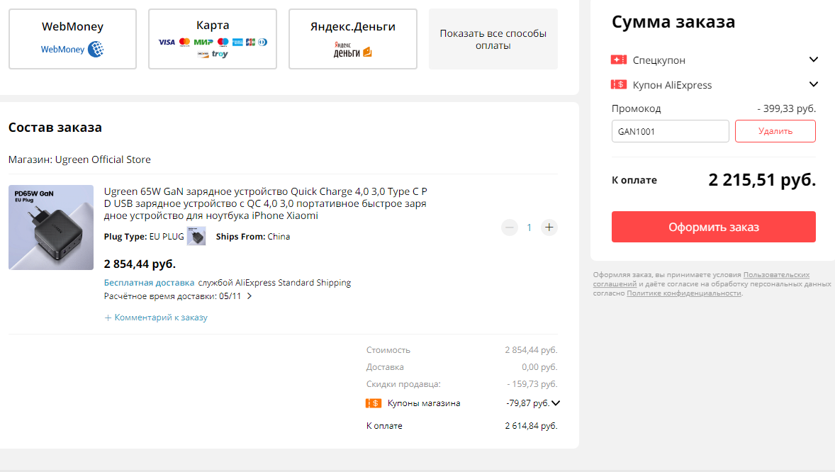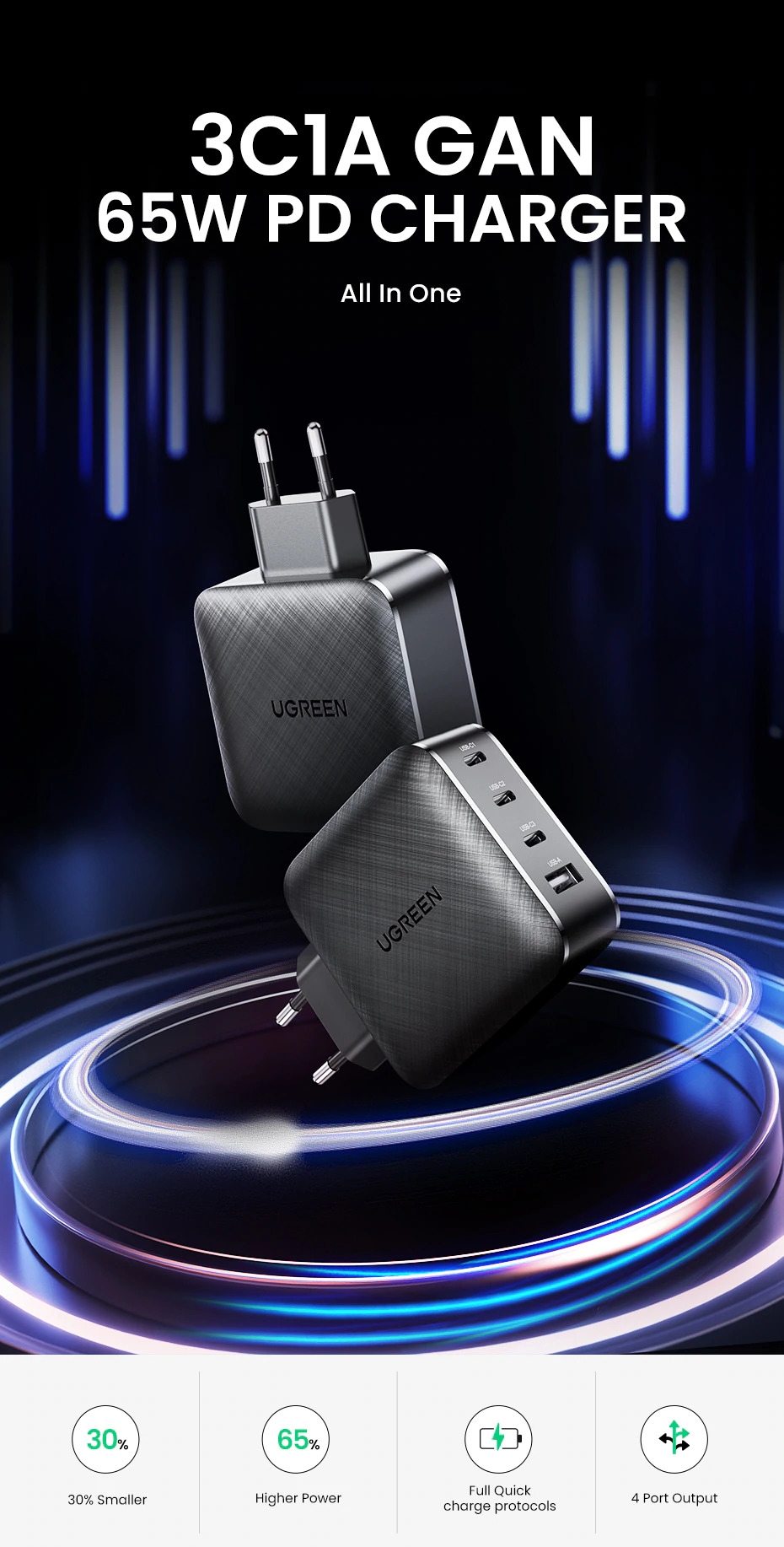 GaN зарядное устройство Ugreen CD224 65W с 4-мя портами на борту. Сейчас очень хорошее предложение - есть скидка продавца - 159,73 руб., купон продавца - 79,87 руб., и промокод - GAN1001 (399,33 руб.). Итоговая скидка: 638,93 руб.