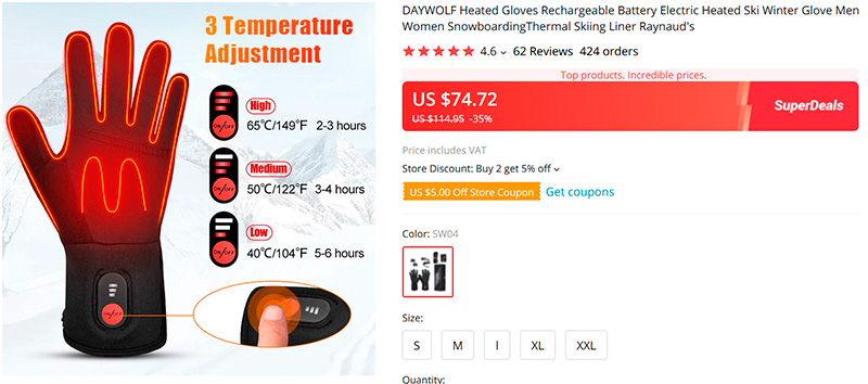 Очень даже актуальное для зимы - зимние перчатки с подогревом из углеродного волокна. Нагревательные элементы расположены на кончиках всех пальцев и на ладони. Три режима работы с регулировкой температуры от 40 до 65 градусов. При температуре в 40 градусов перчатки будут сохранять тепло до 5-6 часов. При температуре в 65 градусов - до 2-3 часов. Есть ускоренная доставка в Россию. И - да, это хороший подарок, между прочим!