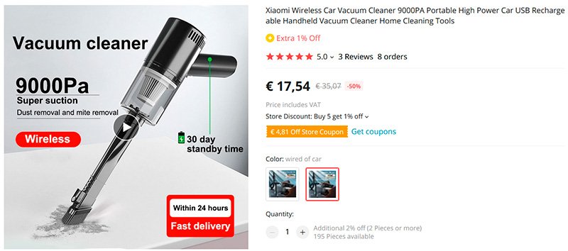 Ручной беспроводной пылесос Xiaomi Wireless Car Vacuum Cleaner с силой всасывания аж на 9000 Па. У меня есть ручной пылесос на 7000 Па - он реально мощный. Циклонный фильтр, в комплекте идет несколько насадок.