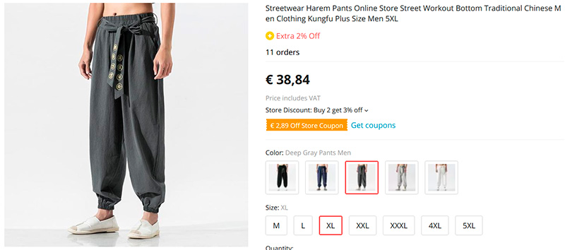 Еще меня там заинтересовали вот такие свободные домашние мужские штаны в китайском стиле. Именно такие штаны дома носят почти все оябуны, я в кино видел. Обязательно сверяйтесь с таблицей размеров, также производитель пишет, что нужно заказывать на 2-3 размера больше вашего обычного.
