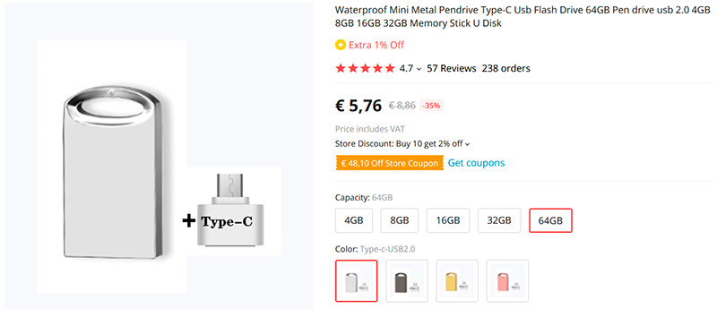 Влагозащищенные суперминифлешки в металличесом корпусе разных цветов и разной емкости от 4 до 64 ГБ. Могут подвешиваться к ключам в качестве брелока. Есть переходник под Type-C - для подключения флешки к смартфонам/планшетам с OTG. У меня на такой записаны сканы всяких важных документов: такое всегда полезно иметь с собой.