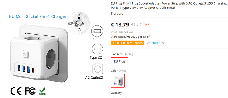 Удобный тройник "7 в 1". Занимает одну розетку, содержит три европейских розетки, три порта USB на 12 ватт и Type-C на 17 ватт. Имеет кнопку включения.