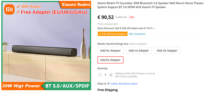 Беспроводной саунд-бар от Xiaomi. Два динамика по 30 ватт, Bluetooth 5.0, имеет также входы SPDIF и Aux для проводного подключения. Может стоять на поверхности или монтироваться на стене (в комплект входит крепление). Управляется кнопками, расположенными на торцевой панели.