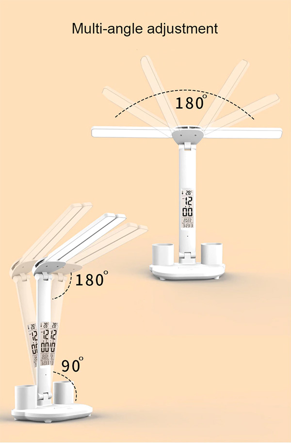 Многофункциональная настольная лампа с дисплеем, на котором отображается дата, время и температура. Два светящихся блока лампы могут поворачиваться на разные углы, также корпус лампы может отклоняться. Есть два подставки под ручки-карандаши. Цветовая температура настраивается, также настраивается уровень яркости. Два вида - без встроенного аккумулятора и с аккумулятором на 3200 мАч.