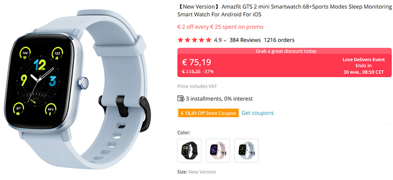Новую версию умных часов Amazfit GTS 2 mini можно сейчас купить с очень хорошей скидкой (порядка 5 тысяч рублей). Качественные часы (я делал обзор Amazfit GTS 2e), хорошее время автономной работы, отлично подходят подросткам, милым дамам, да и мужчинам, которые не любят часы с большим корпусом.