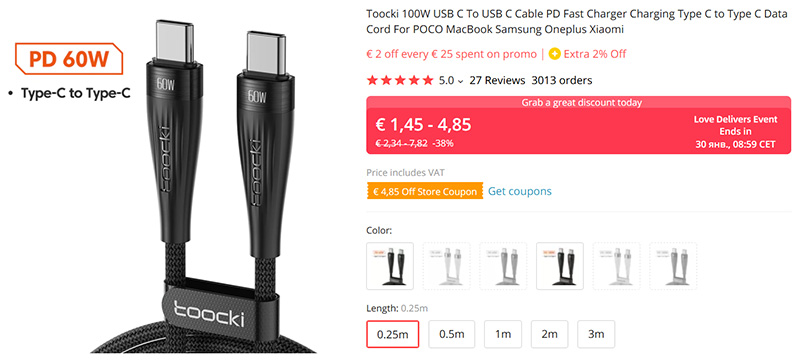 Качественный кабель Type-C - Type-C с поддержкой мощности PD до 60 или до 100 ватт, защищен оплеткой от перегибов, снабжен защитой от перепадов электричества и поддерживает скорость передачи данных до 480 Mbps. И удобно то, что можно выбрать из пяти размеров: от 25 сантиметров до аж 3 метров.