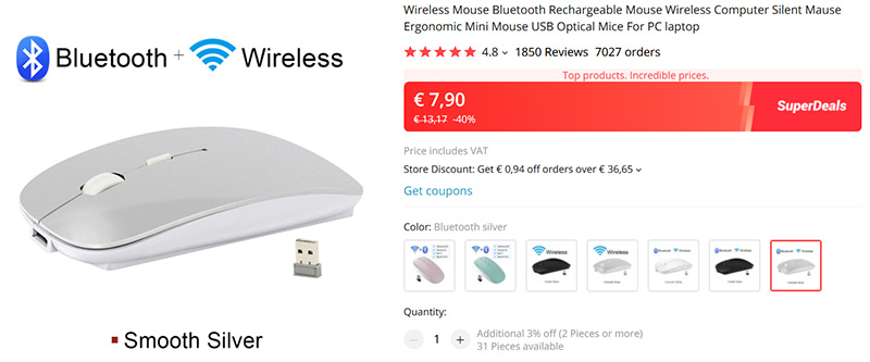 Компактная и совсем недорогая мышь 1600 dpi, поддерживающая подключение как по Bluetooth, так и через беспроводной адаптер. Работает от встроенного аккумулятора, одного заряда хватает на месяц. Бесшумный клик.