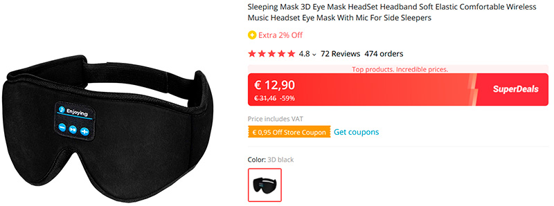 Эргономичная и комфортная маска для сна. Снабжена двумя наушничками, подключается по Bluetooth к смартфону, так что на ночь можно слушать аудиокниги, шум моря или биржевые сводки. Есть кнопки управления воспроизведением и громкостью прямо на маске. Я давно на такую (именно такую) подсел, она очень удобная и отлично защищает от света, особенно по утрам.