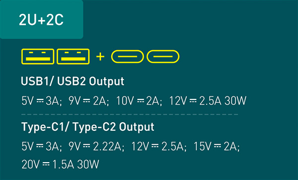 Мощность каждого из портов - от 15 до 30 ватт, что вполне хватит для действительно быстрой зарядки.