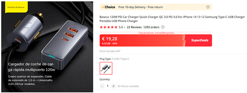 Ну и вот хороший вариант решения - автомобильный адаптер с удлинителем от Baseus на четыре порта и аж на 120 ватт суммарной мощности, что хватит на всех!