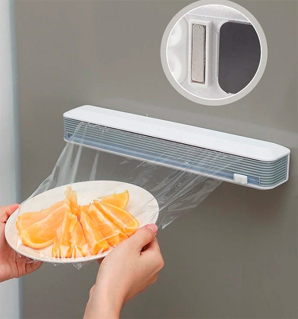 Меня окончательно задолбало обрывать руками или резать ножницами пищевую пленку, которую я постоянно использую для того, чтобы сохранять продукты и блюда в холодильнике свежими, и я решил найти нормальный резак для этой пленки. Ну и, как и ожидалось, у китайцев вариантов - полно! Мне больше всего понравился вот этот вариант - компактный и универсальный. Внутрь вставляется стандартная пищевая пленка, резаком отрезается нужный кусок для упаковки. Может использоваться на столе, может подвешиваться на стене (там есть липучки для крепления). Прям то что нужно!