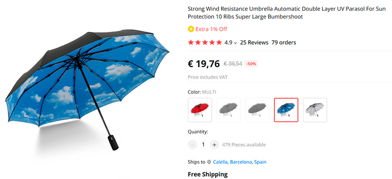 Продвинутый автоматический зонтик: защита от намокания (вода собирается в капли и легко стряхивается), конструкция из 10 спиц, защита от сильного ветра. Ширина зонтика 105 см, высота в сложенном виде - всего 31 см, вес - 490 граммов.